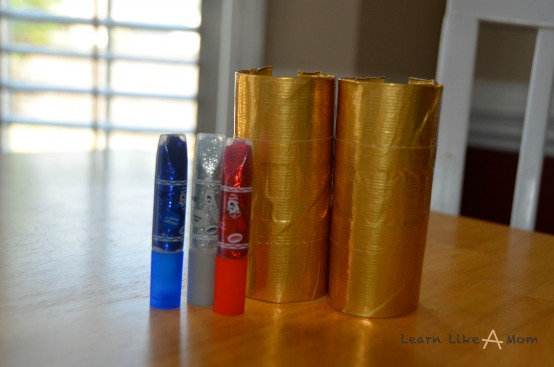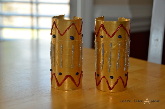 Step Three: Using your choice of glitter glue, decorate the duct taped rolls in any style or pattern you’d like.