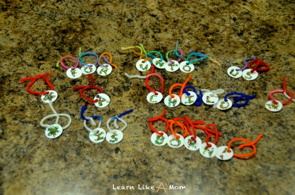 6. Using the hole punch, punch one hole in each circle and tie a loop through the circle with string, yarn, or ribbon. (These are now little ornaments AND a puzzle to complete as your child goes through the advent calendar.)