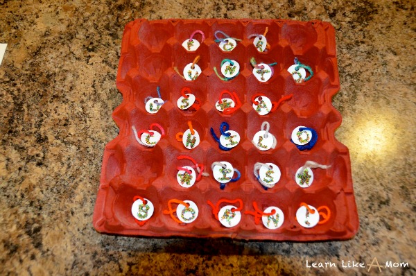 7. Place the ornaments inside the egg carton in the order you’d like your child to receive them.