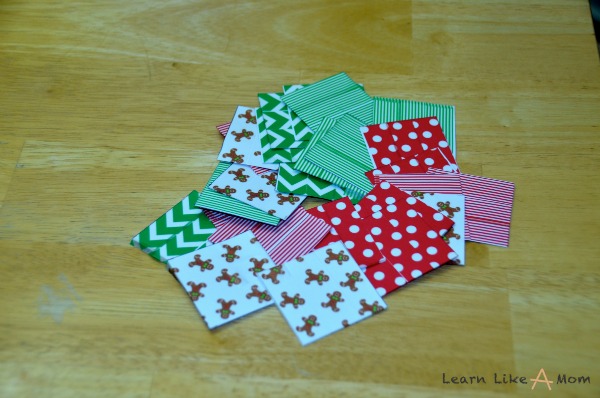 To make this easier, if you have a circle or square cutter or dicut, you can cut circles and squares that way. If you have holiday scrapbook paper, you can use that for the ornaments or squares. Then you don’t have to decorate the circles or the squares. I used a marker at first to number the squares, but it stopped working on the washi tape, so I used scrapbook number stickers.