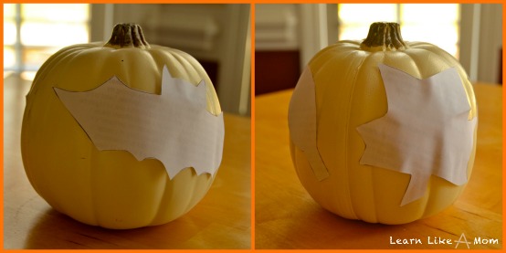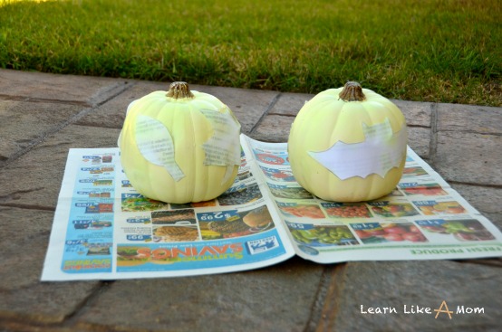 Step Three:Â Tape the stencils to the pumpkins. Make sure you try to get the edges as best you can because when you spray the paint, you don’t really want it going under the paper or you’ll lose the appearance you’re going for.