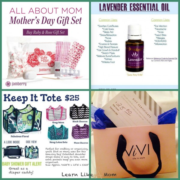 For each consultant you purchase from, you’ll earn one star. All four star achievers will be entered to win our larger raffle that contains one Jamberry Mother’s Day Gift Set, one Young Living Lavender Essential Oil, one Thirty-One Keep It Tote, and one $25 gift certificate to ViVI Jewelry!