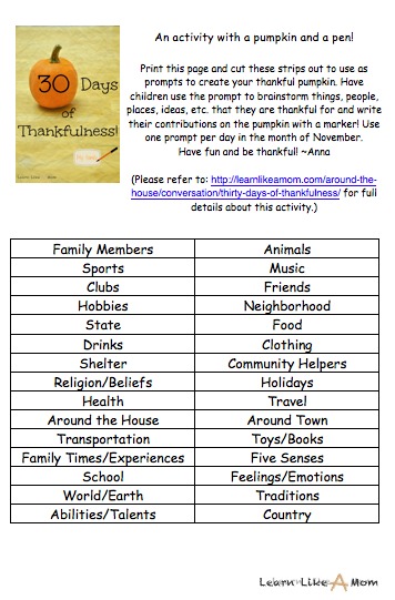 The following document gives brief instructions for this activity. You can clip it to the fridge for this year and/or file it away for next year if you’d like. Or, you can make the conversation more interesting by cutting out the prompt strips from the document and placing them in a jar or container. Each day when you sit down to write on your thankful pumpkin, you can have your child choose a strip to start the discussion.