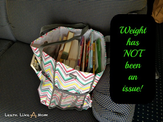 What I have found myself using the tote for the most often is hauling books to and from the library for all of my reading roundups. (If you missed the last one, it was about firefighters and fire safety.) This bag is deceiving because it can hold more than you think, before you even fill the outside pockets! If I was still teaching, it would be my teacher bag.