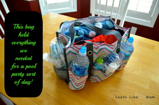 When I packed for a short family road trip to a relative’s house for a pool party, the tote held a change of clothes for four people, two beach towels, bottles of water, regular and swimming diapers, all sorts of sunblock, my wallet, some toiletries, and my camera (which is obviously not in the picture.)