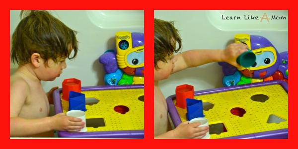 The boys were so excited when they got to play with the Tubby Table. They loved filling and dumping the cups. They’d dump the water through the holes and liked the center one the most. They would try to fill up the cylinder that runs from the table top down to the suction cup end, but there are little holes for drainage (which I really, really liked), so they never won their self-imposed challenge. They also liked trying to complete the puzzle of making sure they placed each cup in its proper hole.