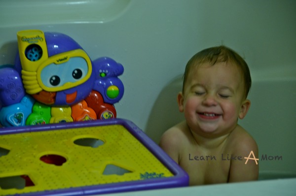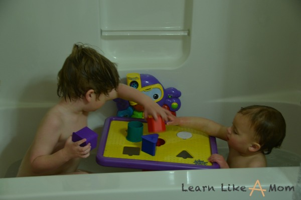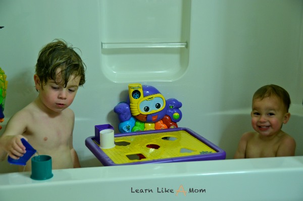 I followed the directions to properly place the Tubby Table in the tub, but for some reason I couldn’t get the suction cup to adhere properly. Well, I thought I did, but then when the boys were playing with it, if they applied pressure to one side, it would tip. If you have younger children that might pull up on it or try to use it to brace themselves, be on the lookout. I wouldn’t want them to fall into the water.
